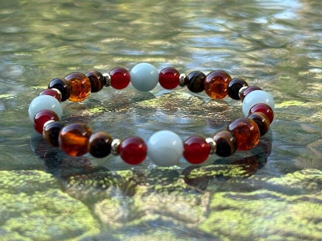 アマゾナイト、アンバー、レッドカーネリアン、タイガーアイ